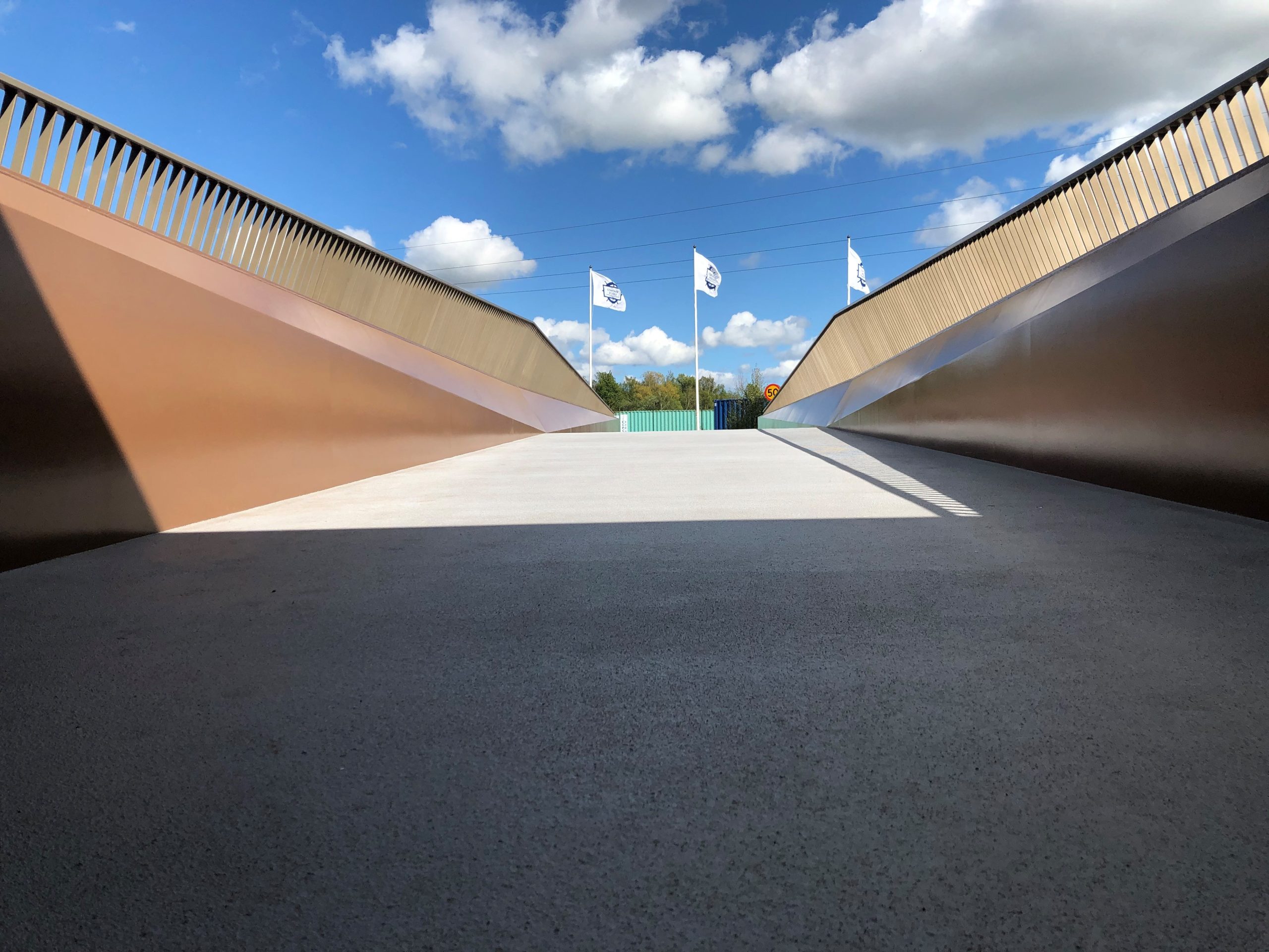 Gång- och cykelbron, som monterats över Varnan i Kristinehamn, ska ge en känsla av lätthet och öppenhet. I mitten av bron öppnar brospannet upp sig på den högsta punkten. Därifrån ges vyer över parken, vattnet och in mot staden. Det är en svart stålbro med tunn brobana och räcken i fyrkantsstål som både hjälper till att framhäva den övergripande formen och bidrar till en känsla av lätthet. Vi kallar den för vår ”Stealth-bro”. Det är en konstruktion med platta och smala ytor, den smyger oupptäckt in genom konkurrenternas luftrum och lämnar dom hänförda.